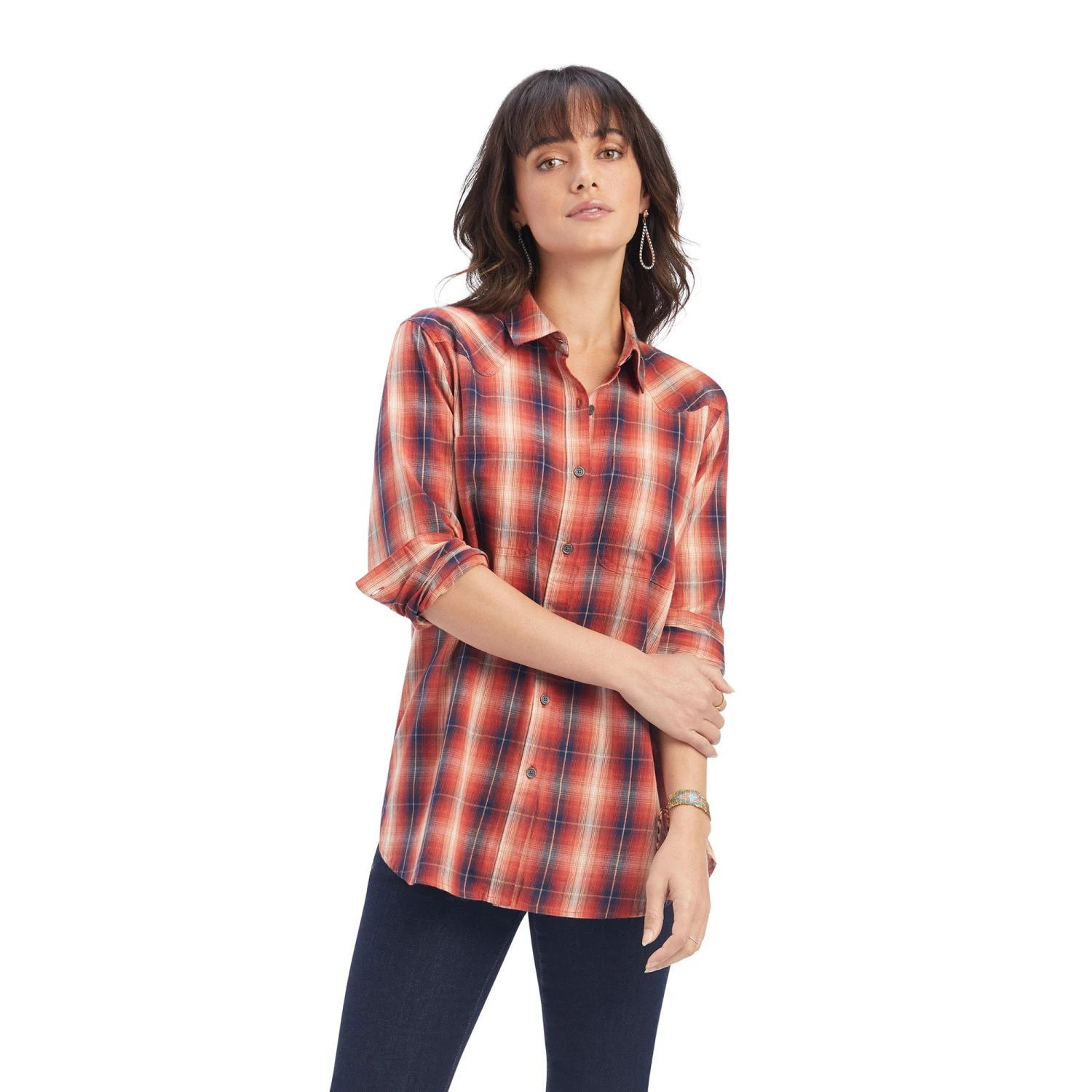 Amado por las vaqueras y probada en rodeos, este top de alto rendimiento tiene todo lo que necesitas. El tejido super suave tiene un estampado clásico que seguro destaca en todos lados. Contiene botones a cada lado que te permiten personalizar la forma de usarlo.
