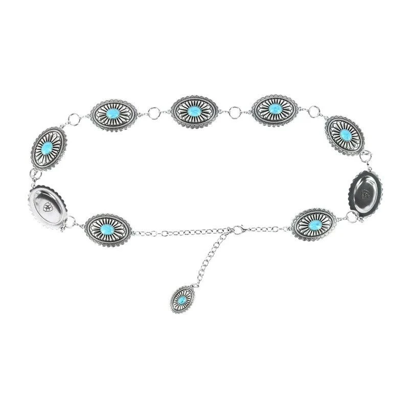 Cinturón de cadena Ariat. Este cinturón presenta hermosos conchos color turquesa, el gancho de cierre hace que este cinturón sea algo ajustable.