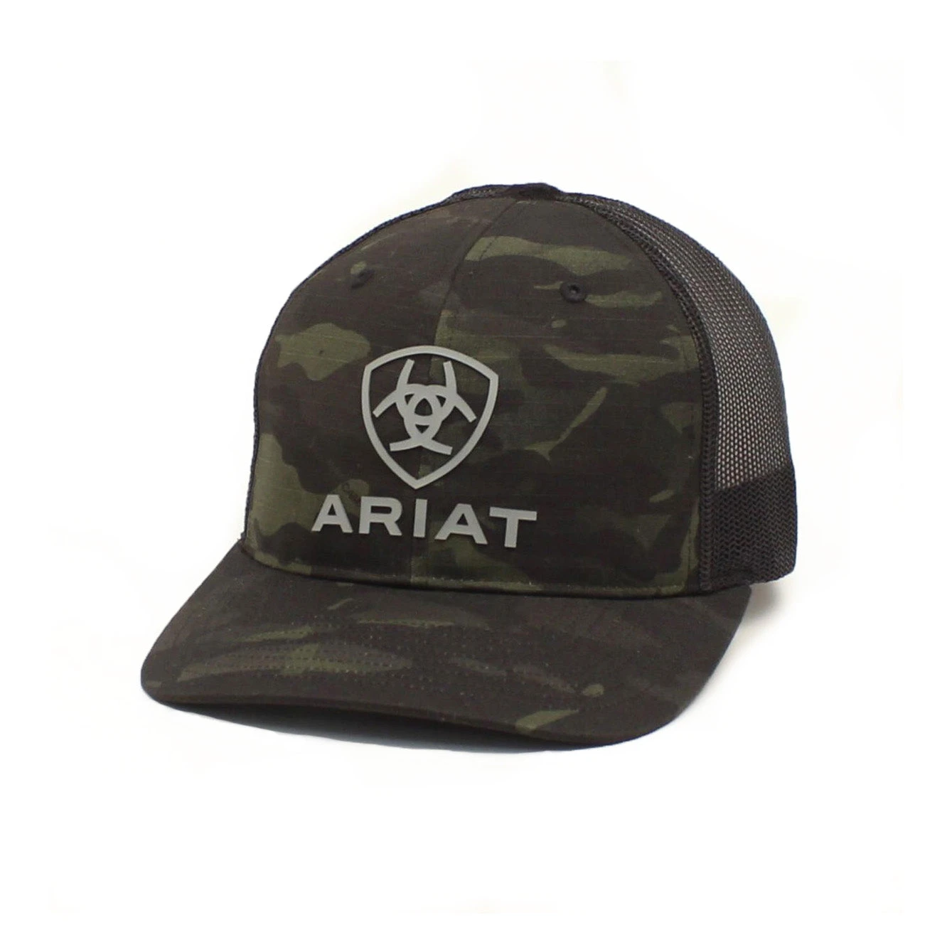 Cómoda gorra Ariat para hombre. Paneles frontales con camuflaje oscuro, visera con logotipo Ariat de goma gris. Paneles traseros de malla negra con cierre a presión para un ajuste perfecto.