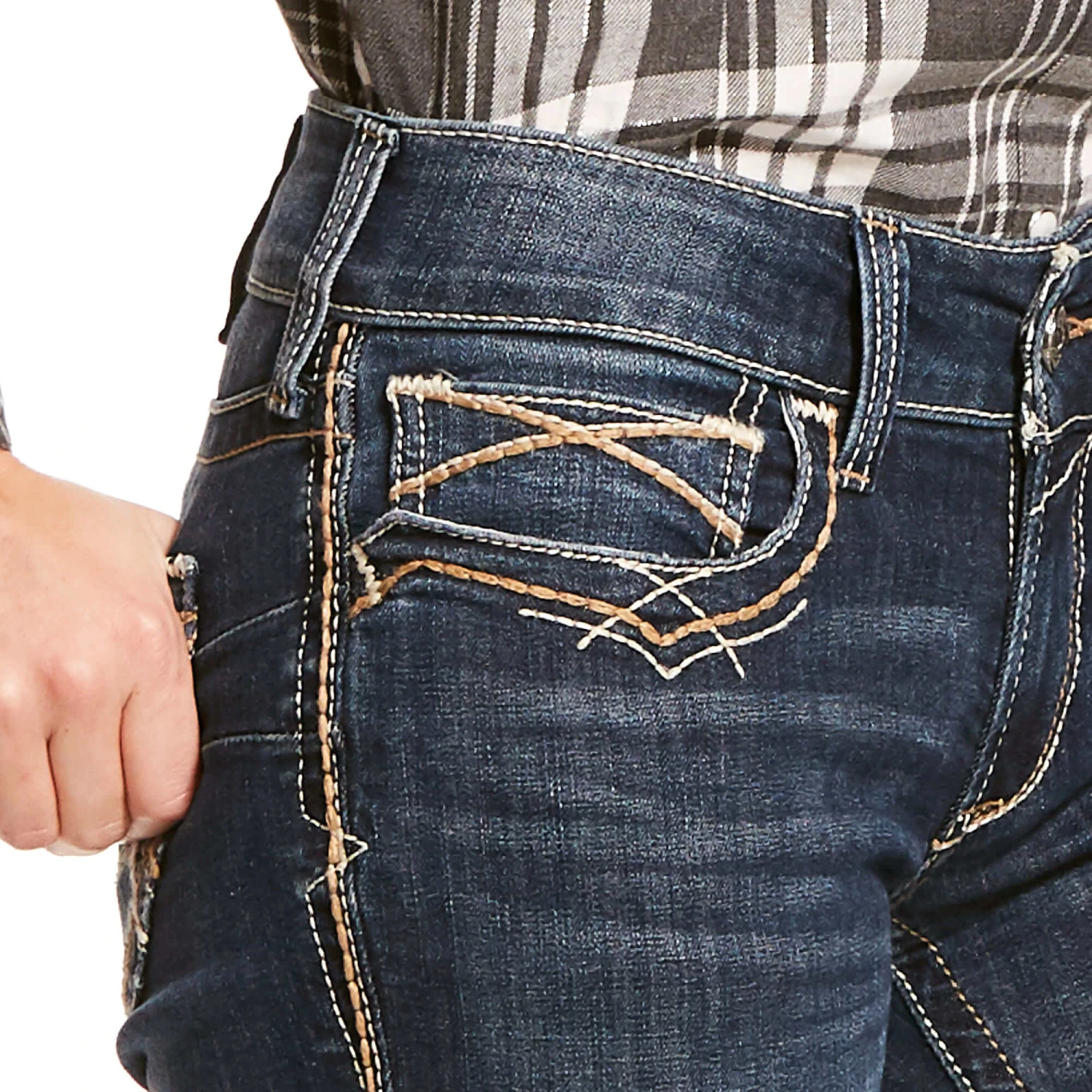 - Lavado oscuro de bolsillos traseros con diseño